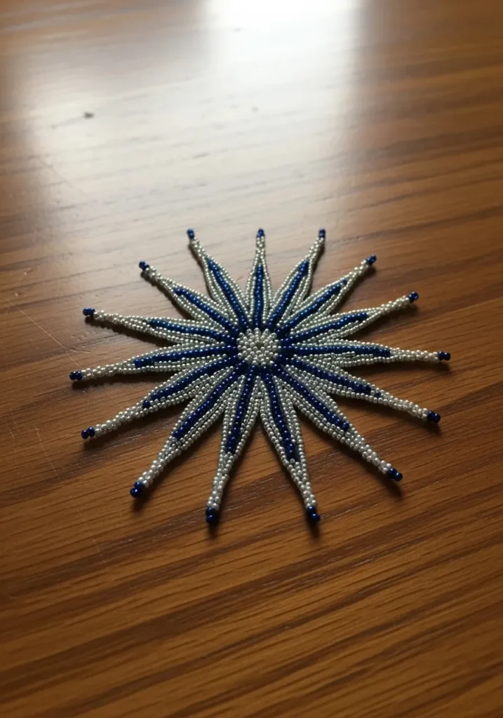 This artistic bead embroidery motif features a striking starburst design stitched with tiny white and deep blue seed beads. A rounded beaded center anchors the piece, while long pointed rays extend outward in alternating rows of crisp white and rich navy. Each ray is carefully shaped to create a clean, symmetrical look, with darker bead tips adding a bold finishing touch. The layered rows give it subtle texture and dimension, and small variations in stitching make it feel beautifully handmade rather than overly perfect.