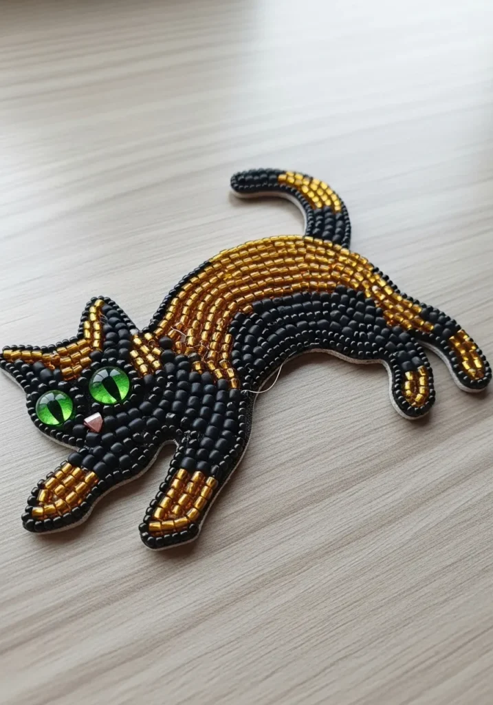 This artistic bead embroidery motif features a stretched out black cat stitched in glossy seed beads on a fabric backing. Deep black beads shape the body and tail, while rows of metallic gold beads flow along the back and legs for a bold contrast. The bright green gem like eyes instantly steal the show and add a playful sparkle. Tiny bead rows follow the curves of the cat, creating movement and texture. A few slight thread pulls and bead spacing quirks give it that true handmade personality.