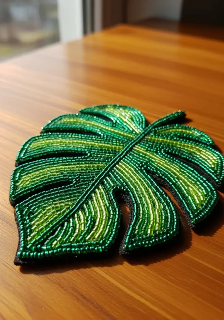 This artistic bead embroidery motif features a bold monstera leaf stitched in layered shades of emerald and lime green beads. Rows of glossy seed beads follow the natural curves of the leaf, highlighting each split and cutout with beautiful dimension. A darker green outline frames the shape, while lighter green beads run through the center to mimic natural veins. The slightly raised beadwork gives it a rich texture, and tiny variations in stitching add that perfectly imperfect handmade touch.