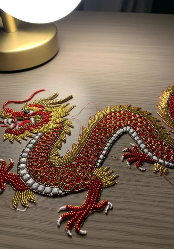 This artistic bead embroidery motif features a bold dragon design stitched in fiery red and shimmering gold beads. The body curves dramatically across the fabric, covered in tiny red seed beads arranged in scale like patterns that create rich texture. Metallic gold beads highlight the mane, claws, and spine, adding depth and a regal glow. Silver accents run along the belly for contrast, while the expressive face is detailed with sharp white fangs and layered beadwork. Slight thread tails and subtle bead variations give it that true handcrafted feel.