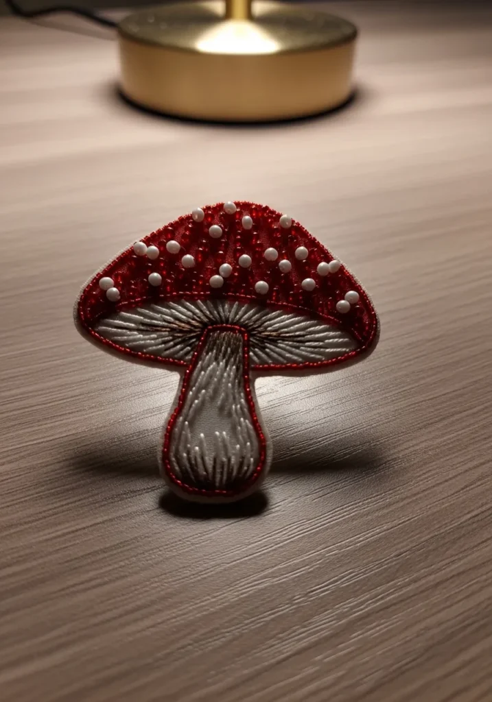 This artistic bead embroidery motif features a classic toadstool mushroom stitched in rich red and creamy white beads. The rounded cap is filled with glossy red seed beads and dotted with raised white bead spots that add playful texture. The stem is created with soft white and light gray beads arranged in vertical lines to mimic natural grooves. A thin red outline frames the entire shape, giving it a crisp and polished look. Slight bead shifts and tiny thread details add to its sweet handmade character.