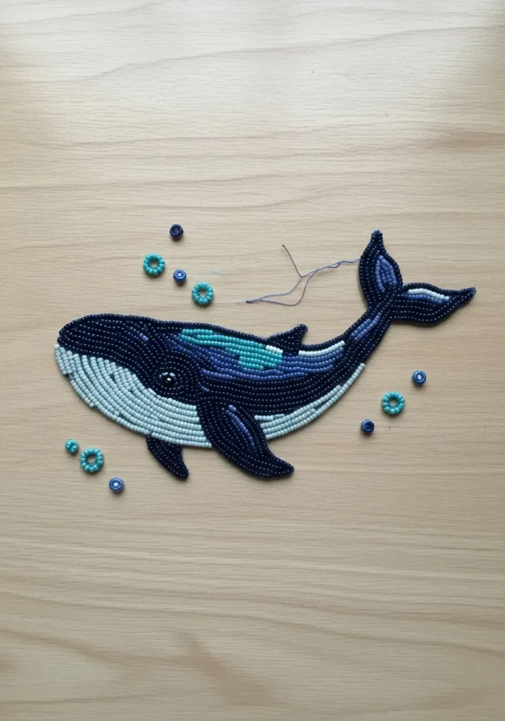 This artistic bead embroidery motif features a beautifully curved whale stitched in deep navy, teal, and soft white beads. The body is filled with neat rows that follow the natural contours, creating a smooth flowing texture that feels almost like water in motion. Lighter beads along the belly add contrast, while hints of turquoise across the back give it depth and dimension. Tiny bead bubbles scattered around the whale enhance the underwater vibe. Slight thread details and subtle bead variations make it feel wonderfully handmade.