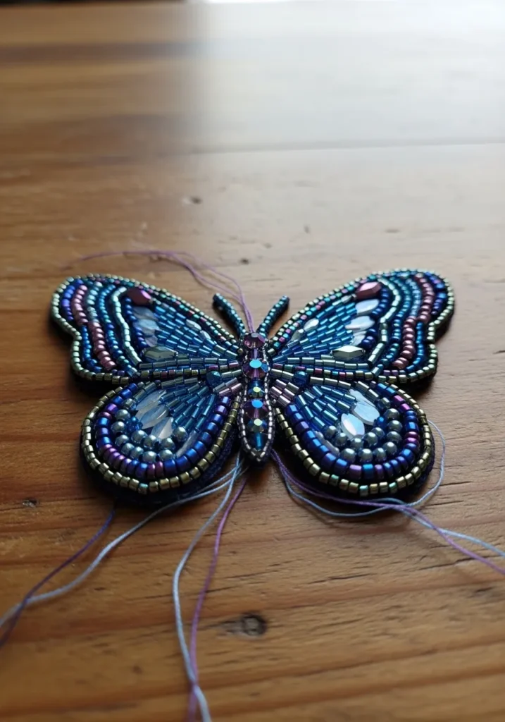 This artistic bead embroidery motif features a bold butterfly design stitched on a dark fabric base, covered in layers of shimmering seed beads and faceted gems. Rich shades of deep blue, teal, violet, and hints of metallic green flow across the wings in curved rows that highlight the shape beautifully. Tiny cylindrical beads add sleek lines, while round beads and crystal like accents create texture and sparkle. You can spot loose thread tails and slight bead spacing variations, which give it that honest handmade charm we all love.