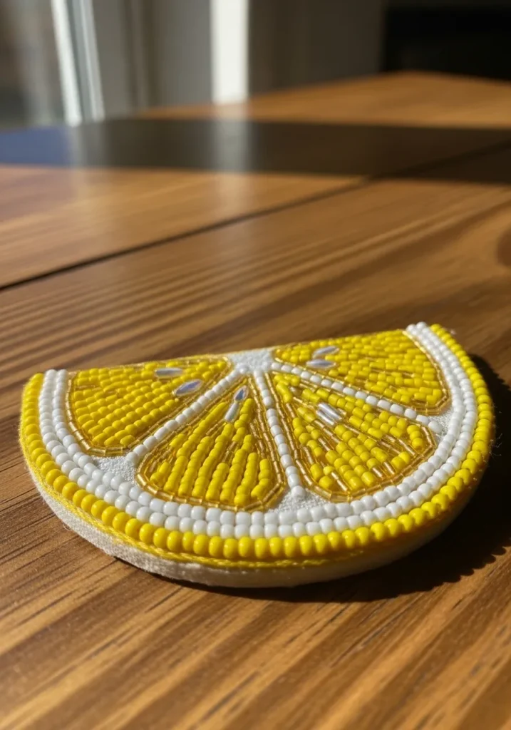 I love how this kind of motif instantly feels cheerful and refreshing. The bold yellow pops beautifully against any background, which makes it such a fun accent piece for bags or hoops. If you are into playful food inspired designs, this one is surprisingly easy to tackle. Stitching the little segments feels so satisfying, and watching that citrus shape come together bead by bead is pure crafty joy.