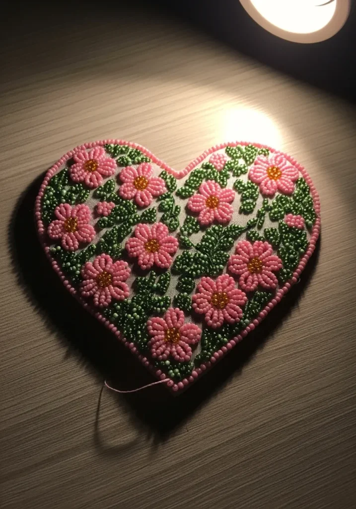 This artistic bead embroidery motif features a heart shape completely filled with tiny pink blossoms and lush green leaves. The outer edge is outlined with soft pink beads that frame the design beautifully. Inside, clusters of blush pink petals surround golden bead centers, while rich green beads create textured leaves and delicate vine details. The mix of rounded seed beads and slightly raised floral elements gives the piece lovely depth. Small stitching variations and subtle bead shifts add to its sweet handmade charm.
