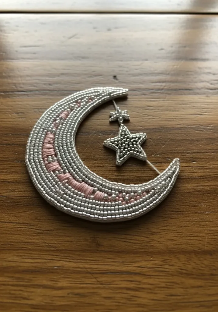 This bead embroidery motif features a graceful crescent moon stitched in shimmering silver seed beads that curve smoothly around the shape. Soft blush pink thread fills sections inside the moon, adding a gentle contrast and a hint of warmth. The surface has a beautiful layered texture thanks to neat rows of beads that follow the curve perfectly. A tiny dangling star, also fully beaded in silver tones, hangs from the tip of the moon and adds a delicate, dreamy touch that makes the whole design feel magical.