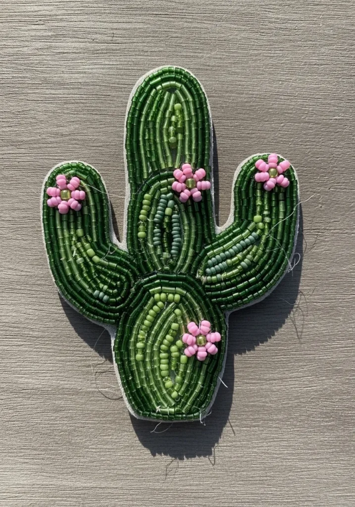 This bead embroidery motif showcases a charming cactus silhouette stitched with glossy green bugle beads and seed beads in layered shades. The curved rows follow each arm and the center stem, creating a natural ribbed look that gives the cactus dimension and movement. Soft pink bead flowers sit on the tips and lower section, each with a tiny center bead that makes them pop. The clean white felt backing outlines the shape and keeps the whole design looking neat and defined.