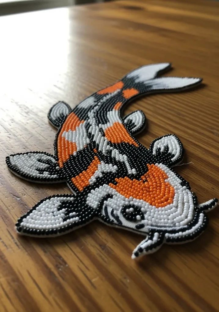 This bead embroidery motif captures a graceful koi fish in bold shades of orange, black, and white. Tiny seed beads are carefully stitched in curved rows that follow the natural flow of the fish’s body, giving it beautiful movement and depth. The fins are outlined in black beads for definition, while the orange patches stand out against the crisp white and deep black sections. The layered beadwork creates a smooth, almost scaled texture that feels rich and detailed from head to tail.