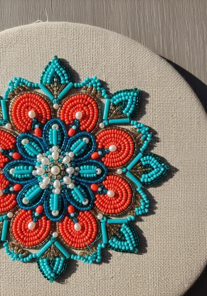 This artistic bead embroidery motif features a striking floral mandala stitched onto a neutral fabric base inside an embroidery hoop. Layers of coral red and turquoise seed beads form rounded petals that radiate from a detailed center filled with creamy pearl beads and deep teal accents. Small metallic beads peek through between the petals, adding a subtle shimmer and extra texture. The raised beadwork creates beautiful dimension, and tiny variations in bead size and stitching give it that perfectly imperfect handmade feel.