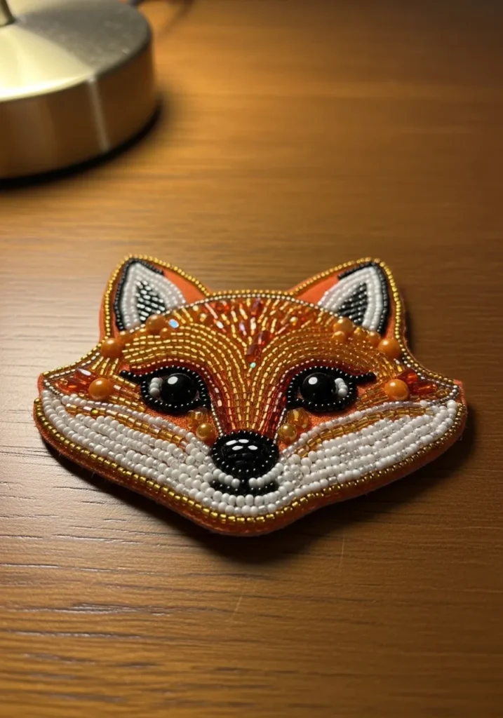 This artistic bead embroidery motif features an adorable fox face stitched as a bold patch design. Tiny orange and amber seed beads create soft fur texture across the forehead, while crisp white beads shape the cheeks and muzzle. Glossy black beads bring the eyes and nose to life, giving the fox that sweet, curious expression. Gold beads outline the entire shape, adding definition and a subtle glow. The layered bead rows and slight variations in spacing give it rich dimension and a lovely handmade feel.