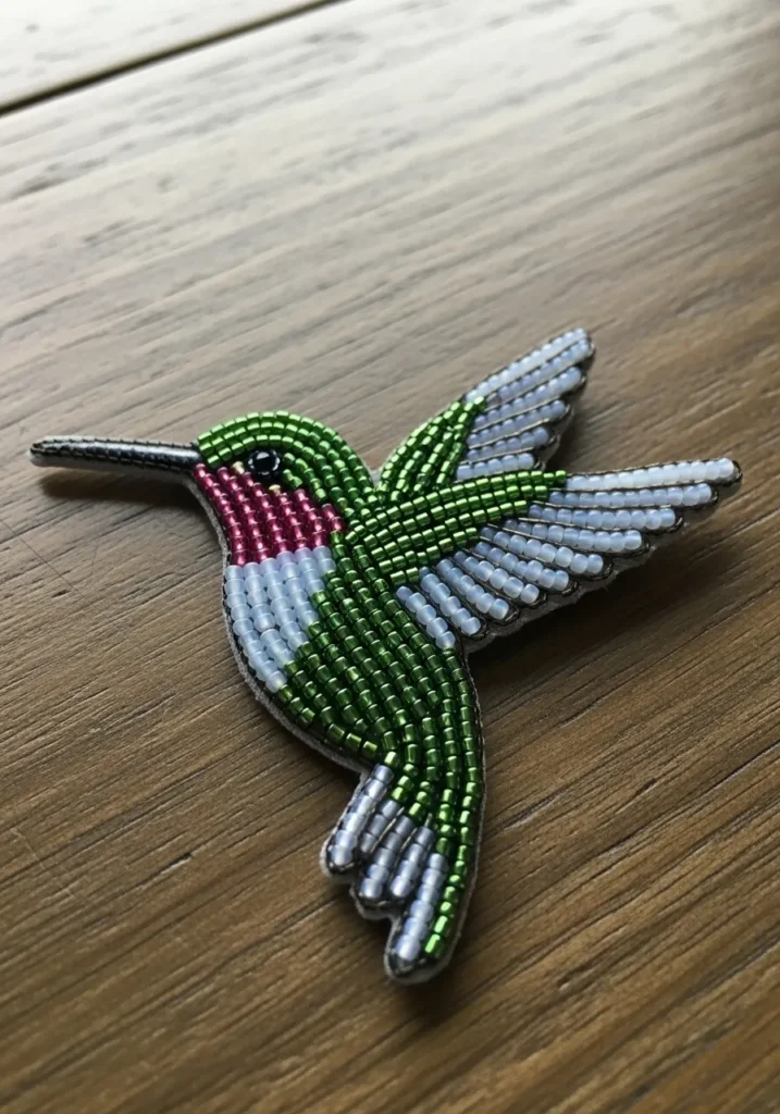 This artistic bead embroidery motif showcases a graceful hummingbird captured mid flight, stitched onto a fabric base with shimmering seed beads. Glossy green beads shape the wings and tail, while soft white beads highlight the feathers for contrast and depth. A pop of rosy pink at the throat adds that classic hummingbird charm, and a tiny black bead brings the eye to life. The rows of beads follow the natural curves of the bird, creating beautiful texture and movement with subtle variations that make it feel lovingly handmade.