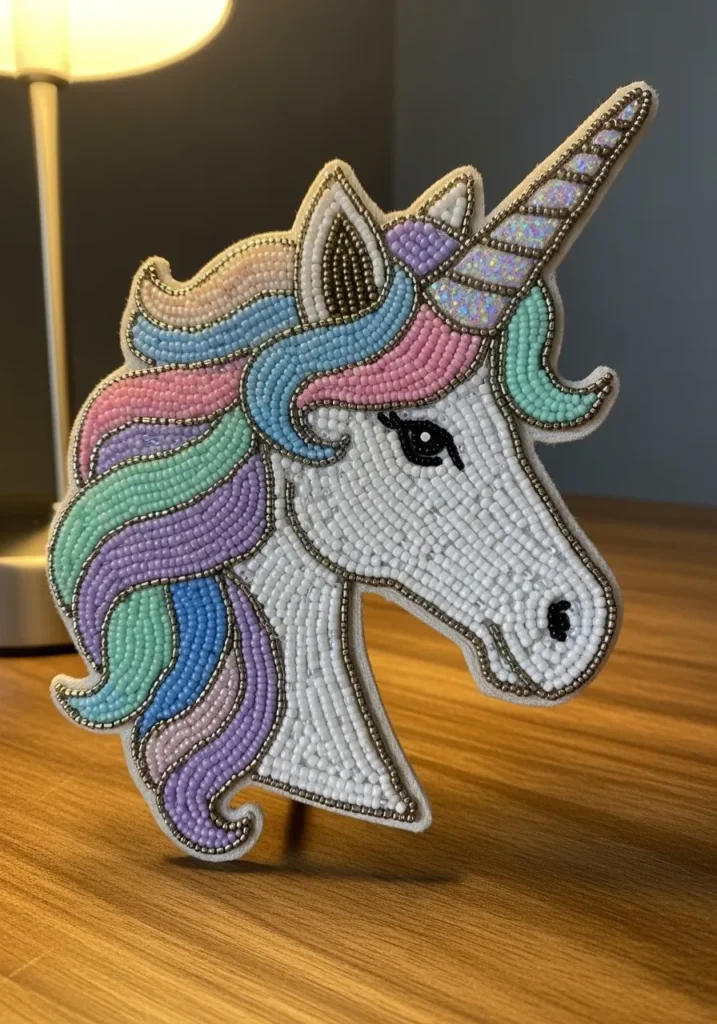 This artistic bead embroidery motif features a dreamy unicorn head stitched in soft pastel tones on a sturdy fabric backing. Tiny white seed beads shape the face, giving it a smooth and slightly raised texture. The flowing mane is created with curved rows of lavender, mint, baby blue, and blush pink beads that add beautiful movement and dimension. The horn sparkles with iridescent beads outlined in metallic accents, while glossy black beads define the eye for a sweet and expressive look. Subtle variations in bead size and stitching make it feel lovingly handmade and full of charm.