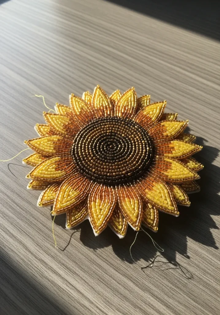 This artistic bead embroidery motif captures the beauty of a sunflower in full bloom. The center is stitched with tight spirals of deep brown beads that create a rich, textured focal point. Surrounding it, layered petals shimmer in warm shades of golden yellow and amber, each outlined with tiny metallic beads for extra definition. The pointed petals are slightly raised, giving the flower lovely dimension. A few visible thread tails and subtle bead variations add that authentic handmade character we all appreciate.