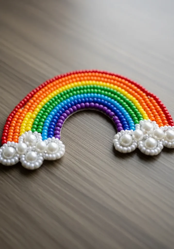 This bead artwork features a cheerful rainbow formed from neat rows of glossy seed beads in classic red, orange, yellow, green, blue, and purple. Each color band curves smoothly to create a perfect arch shape. At both ends, fluffy cloud clusters are crafted from pearly white beads arranged in soft rounded forms. The combination of bright matte colors and shiny pearl accents gives the piece contrast and dimension. The clean outline and balanced shape make it feel playful yet polished.