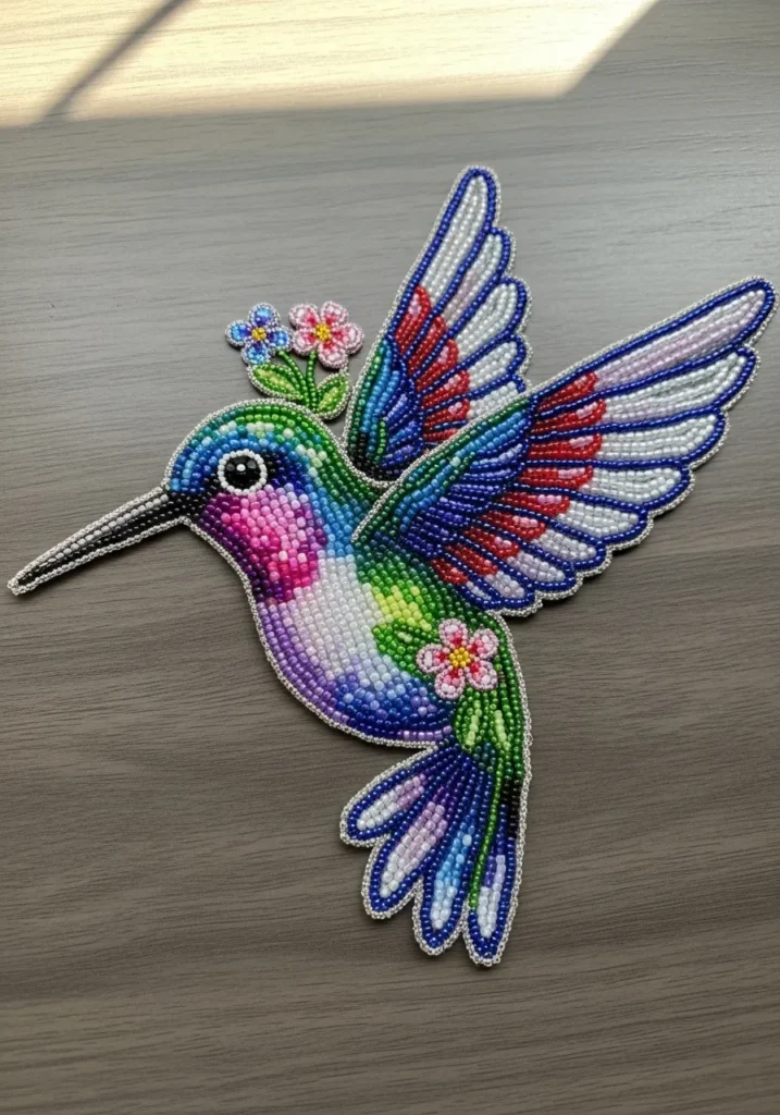 This bead artwork features a vibrant hummingbird brought to life with tiny glass seed beads in electric blues, leafy greens, soft purples, bright pinks, and crisp whites. The wings are spread wide, detailed with layered beadwork that creates a feathery texture and beautiful movement. Delicate floral accents near the bird add a sweet, garden inspired touch. The glossy beads catch the light in such a pretty way, giving the whole piece a slightly raised, dimensional look that feels both intricate and playful.