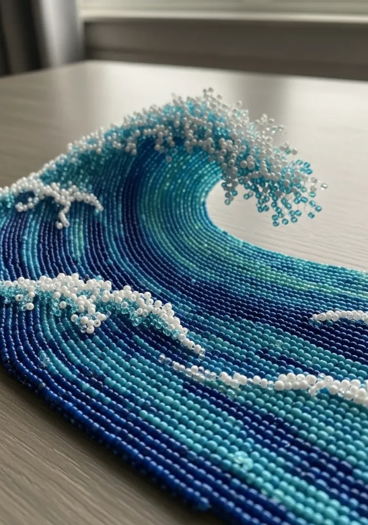 This bead artwork captures a powerful curling ocean wave using rows of tiny seed beads in deep navy, turquoise, and seafoam green. The beads are arranged in flowing curved lines that mimic the natural movement of water. Along the crest, clusters of white and translucent beads create a frothy splash effect that looks almost three dimensional. The layered beadwork gives the piece texture and depth, especially where the wave curls over itself. The gradual color shift from dark blue at the base to lighter aqua at the top makes it feel fresh and full of motion.