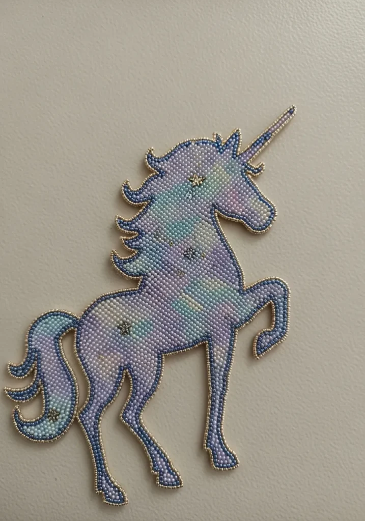 This bead artwork features a graceful unicorn silhouette covered in tiny seed beads in soft pastel shades of lavender, baby blue, mint, and blush. The colors blend gently across the body, creating a dreamy ombré effect that feels almost magical. A delicate metallic bead outline traces the entire shape, giving it a crisp, polished edge against the wall. Small star details scattered across the body add a subtle sparkle, while the flowing mane and tail are shaped with curved bead lines that give the piece movement and charm.