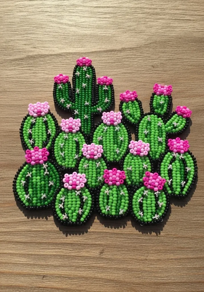 This bead artwork showcases a charming cluster of cacti made entirely from glossy green seed beads in different shades for depth and dimension. Each cactus pad is outlined in black beads, which makes the shapes pop beautifully against the background. Tiny white bead stitches mimic little cactus spines, while bright pink bead blossoms sit on top like cheerful crowns. The arrangement forms a full, rounded composition that feels lush and playful. The raised texture from the tightly packed beads gives the piece a tactile, almost quilted look that makes it extra eye catching.