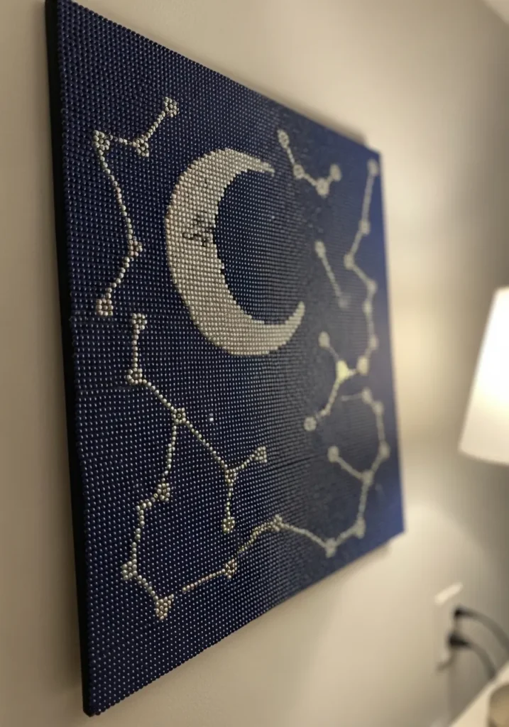 I love how this piece instantly turns a plain wall into something magical. It feels artsy but still totally doable if you are patient and enjoy working with small details. Playing with different shades of blue and purple makes the whole process feel creative and relaxing. This is the kind of project I would put on some music for and happily spend an afternoon bringing a little sparkle to my space.