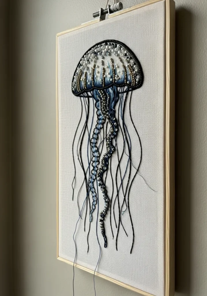 This framed embroidery piece features a graceful jellyfish brought to life with layered beaded texture embroidery. The dome of the jellyfish is stitched with pearly white and smoky gray beads that create a rounded, almost translucent effect. Soft blue and navy beads add shading and depth along the body, while long flowing tentacles combine beads and loose threads for extra movement. The contrast between the structured beadwork and the delicate dangling strands makes the design feel dynamic and full of life against the neutral fabric background.