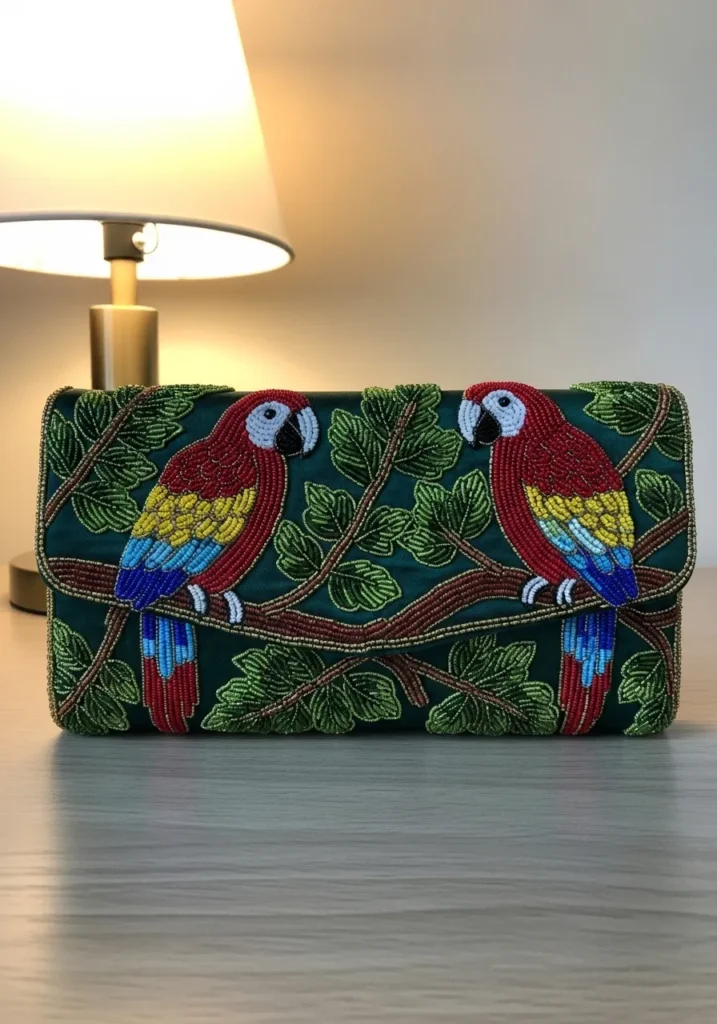 This embroidered clutch is a bold statement piece covered in rich beaded texture embroidery. Two vibrant parrots are stitched in layers of red, yellow, and electric blue beads, perched on winding brown branches. The background is a deep emerald green fabric, which makes the colors pop even more. Each leaf is outlined and filled with tiny green beads that create raised texture and beautiful dimension. The beadwork is dense and detailed, giving the entire surface a luxurious, almost sculpted feel.