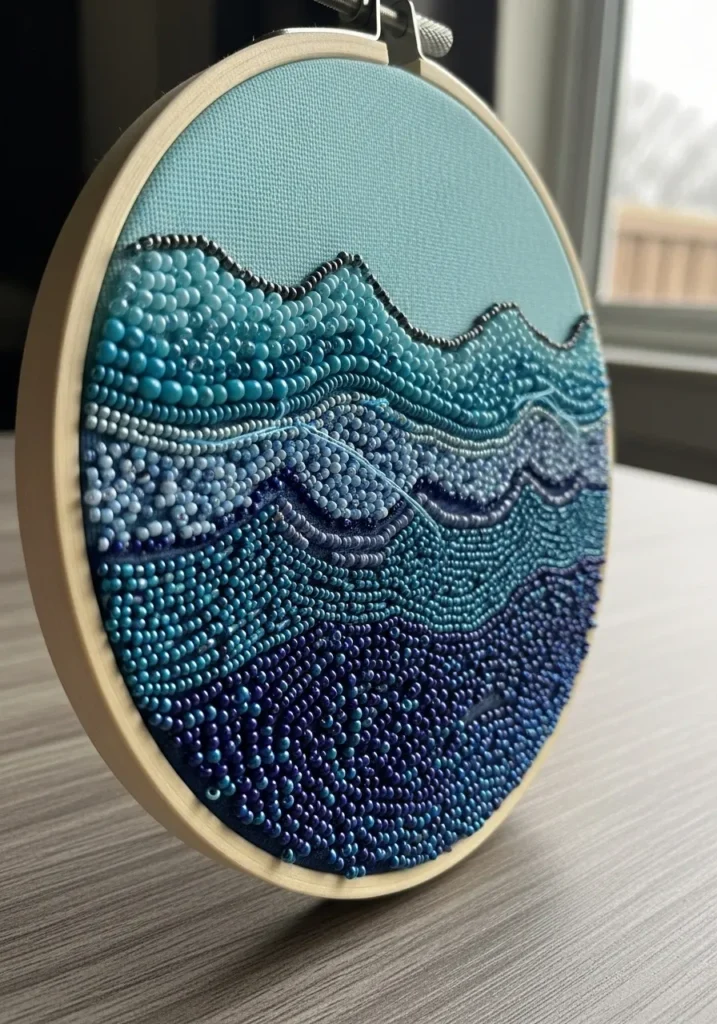 • Layered Ocean Waves Beaded Embroidery Hoop