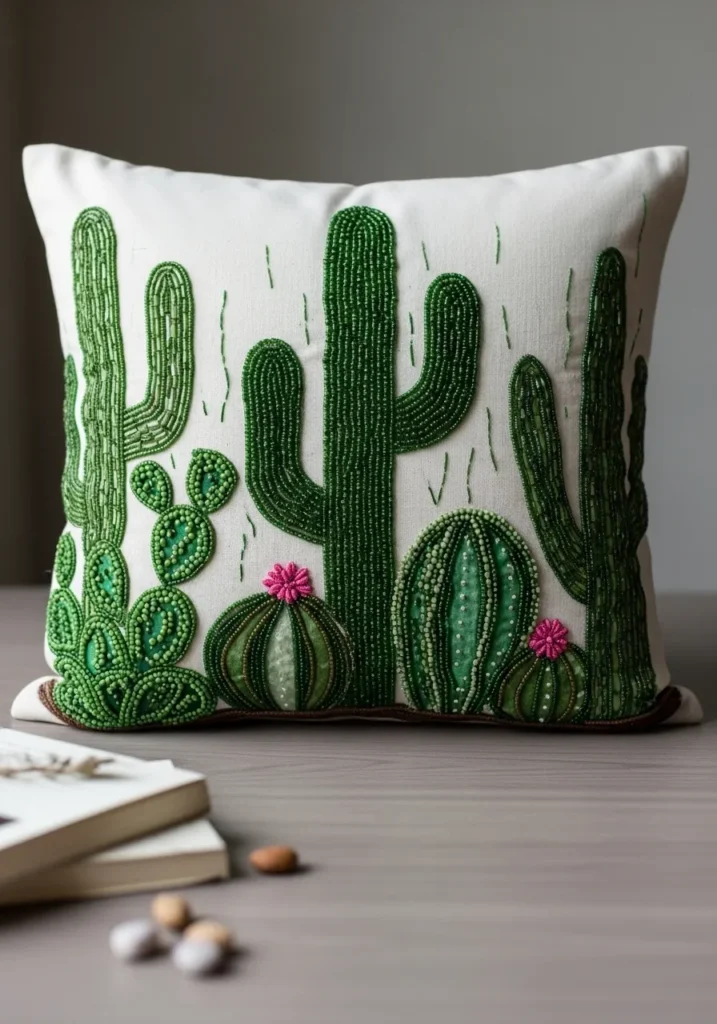 This embroidered pillow features a playful desert scene brought to life with rich beaded texture embroidery. Tall and rounded cacti are stitched in layers of deep emerald, moss, and soft sage beads, creating a raised and slightly sculpted effect across the fabric. Tiny bead lines form the cactus ridges, while small pink blossoms add sweet pops of color. The mix of dense bead clusters and neatly outlined shapes gives the design depth and personality against the clean white pillow background.