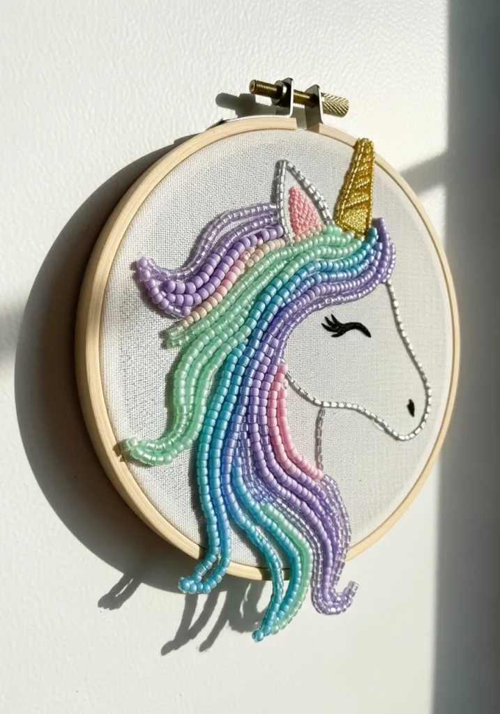 This round embroidery hoop features a dreamy unicorn profile brought to life with layered beaded texture embroidery. The flowing mane is stitched in soft pastel beads in shades of lavender, mint, baby blue, and blush pink, arranged in curved rows that create beautiful depth and movement. A metallic gold beaded horn adds a touch of sparkle, while delicate white bead outlines define the face against the neutral fabric. The raised bead strands give the mane a cascading effect that almost feels like it is swaying.