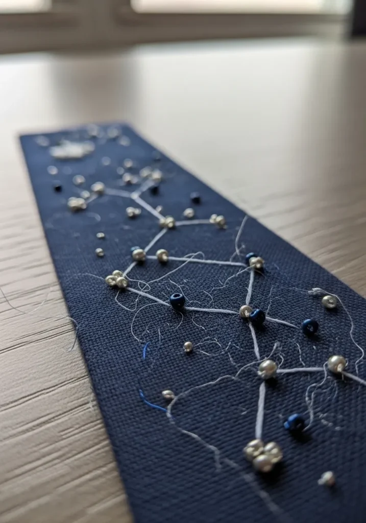 This slim embroidered bookmark features a delicate constellation design stitched onto deep navy fabric. Fine white thread lines connect tiny silver and midnight blue beads, forming a star pattern that stretches gracefully down the length of the piece. The beads are slightly raised, adding subtle texture and depth against the smooth dark background. A few scattered beads mimic distant stars, giving the whole design a soft celestial sparkle without overwhelming the clean, minimal layout.