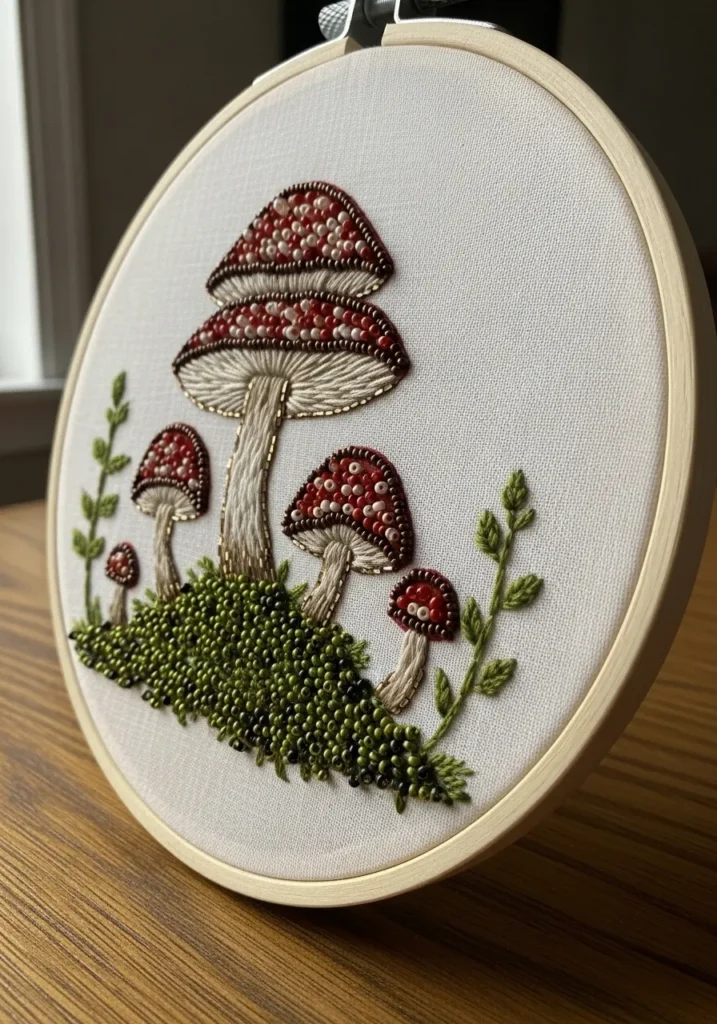 This round embroidery hoop showcases a charming cluster of woodland mushrooms stitched with rich beaded texture embroidery. The caps are covered in deep red beads dotted with soft ivory accents, creating that classic storybook look with beautiful raised texture. The stems are formed with smooth thread stitches that contrast nicely against the densely beaded caps. At the base, tiny green beads build up a mossy mound that adds extra depth and dimension, making the whole forest scene feel layered and alive against the neutral fabric.