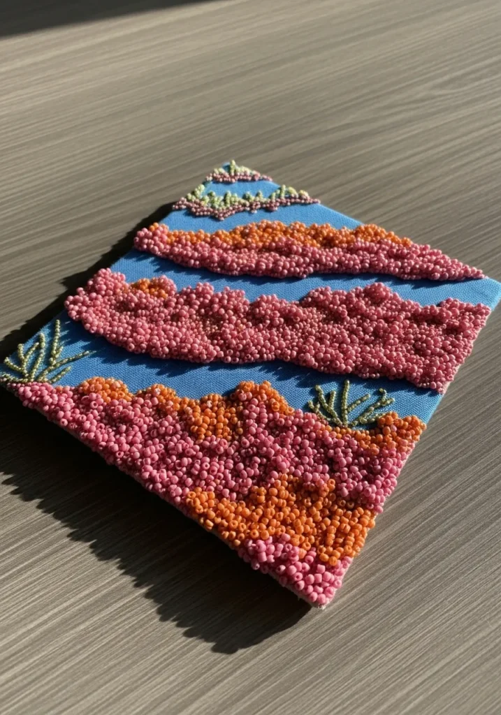 This embroidered fabric panel captures a dreamy underwater coral reef scene using thick clusters of beaded texture embroidery for serious depth. Layers of tiny pink and coral toned beads are stitched densely to create bumpy, organic reef formations that rise off the blue fabric background. Hints of warm orange beads add contrast and dimension, while delicate green stitched details mimic small sea plants peeking through. The mix of tightly packed bead clusters and smooth negative space makes the whole piece feel vibrant and alive.