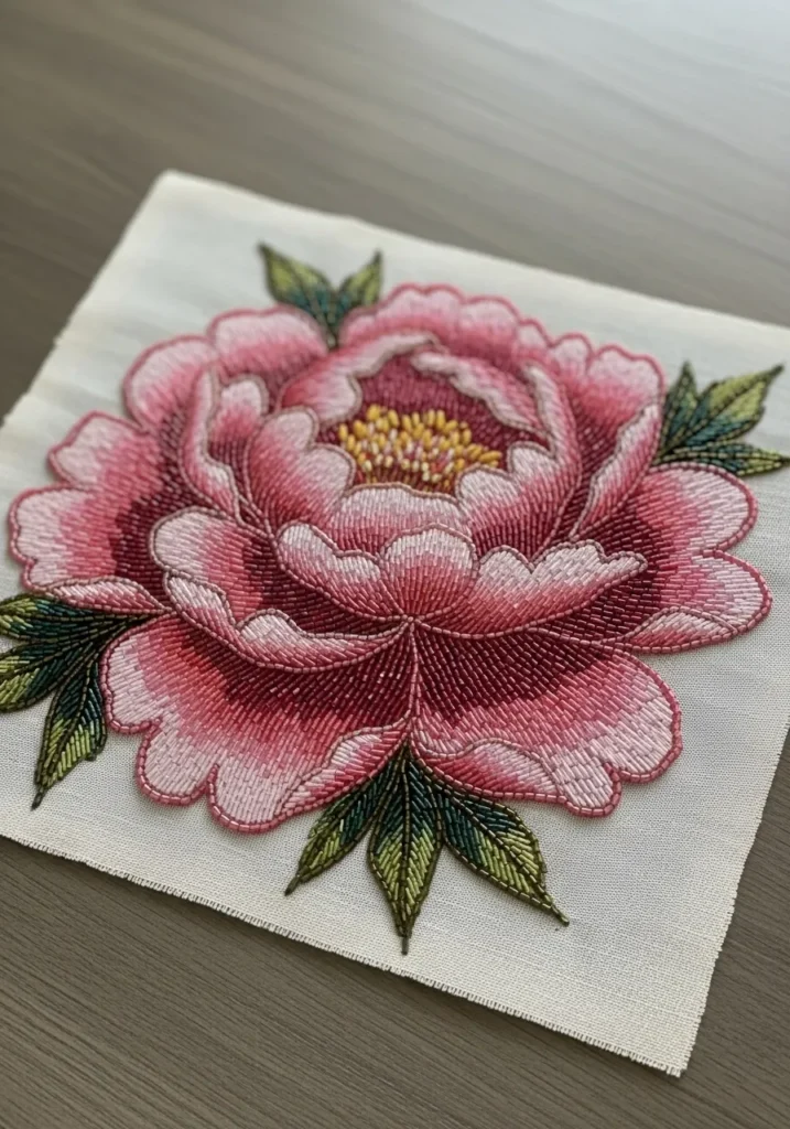 This embroidered fabric panel showcases a lush peony brought to life with intricate beaded texture embroidery. Layers of soft pink, blush, and deep rose beads form each petal, stitched in curved rows that create beautiful depth and dimension. The center glows with tiny golden beads that add contrast and sparkle, while the leaves are shaped with slender green beads in olive and forest tones. The raised texture gives the flower a sculpted look, almost as if it could lift right off the fabric.