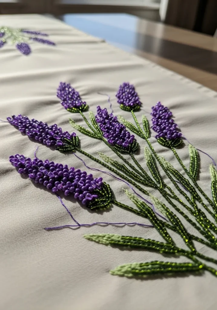 This elegant fabric panel features delicate lavender sprigs stitched with beautiful beaded texture embroidery. Clusters of tiny purple beads form each blossom, layered closely together to create soft rounded texture and gentle dimension. The stems and slender leaves are embroidered in varying shades of green beads and thread, giving them a natural tapered look. The light neutral fabric background keeps the focus on the rich purples and fresh greens, while the raised bead clusters make the flowers feel almost touchable.
