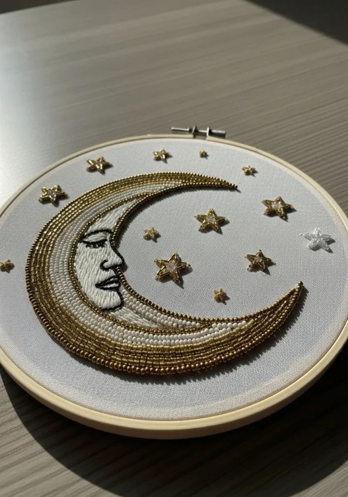 • Celestial Moon And Stars Beaded Embroidery Hoop
