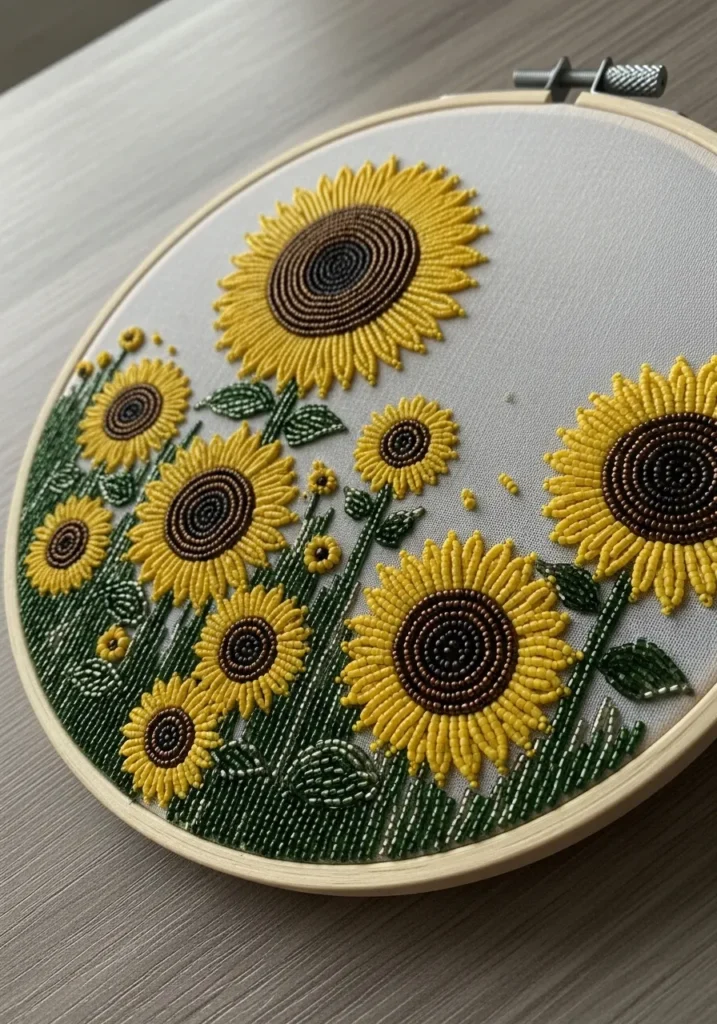 I adore how happy this piece feels. It is bright, bold, and impossible to ignore. If you are into floral designs that really pop off the fabric, this is such a satisfying project to try. Filling in those petals bead by bead is oddly calming, and watching the sunflowers slowly bloom under your hands feels magical. It is the kind of hoop you hang up and instantly feel a little burst of sunshine in the room.