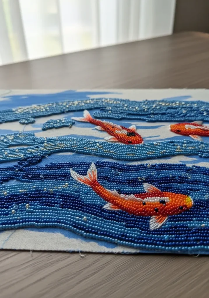 This embroidered fabric panel captures a serene koi pond scene using rich beaded texture embroidery for incredible depth. Layers of tiny blue beads flow across the surface to create rippling water, shifting from pale sky blue to deep navy for a realistic sense of movement. Bright orange and white koi fish swim through the waves, their bodies carefully shaped with densely stitched beads that give them a slightly raised, sculpted look. Small scattered beads add the sparkle of light reflecting on water, making the whole design feel lively and dimensional.