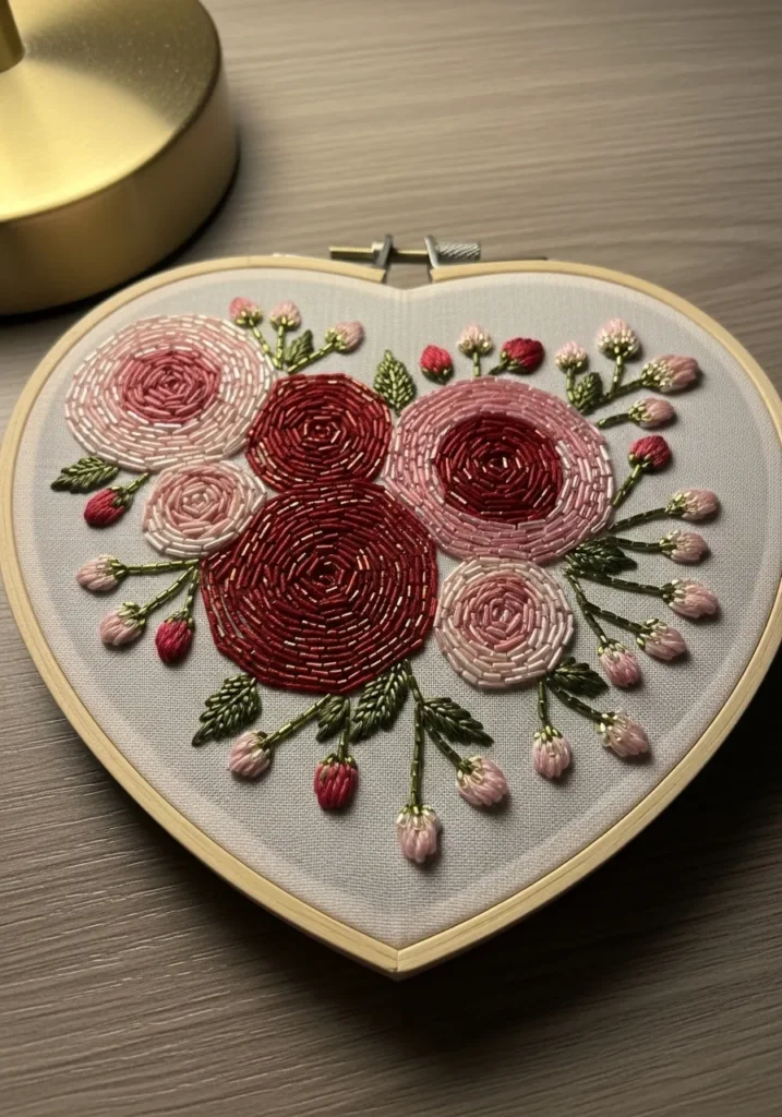 This heart shaped embroidery hoop features a lush bouquet of roses created with layered beaded texture embroidery. Each bloom is stitched in tight spirals of blush pink, dusty rose, and deep burgundy beads, giving the petals beautiful dimension and a softly sculpted look. Tiny bead buds and slender green stems frame the larger flowers, while textured leaves add contrast in rich olive tones. The neutral fabric background keeps the focus on the raised beadwork, and the wooden heart frame makes the whole piece feel extra sweet and special.