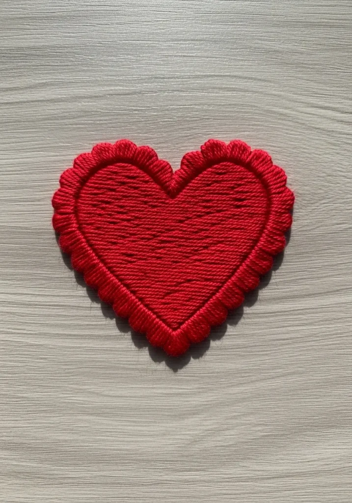 This bold red heart embroidery stands out with its plush, densely stitched surface. The edges are finished neatly with blanket stitch for a defined outline, while the center is filled with tightly packed satin stitches that create a rich texture. Against the neutral background, the color really pops.