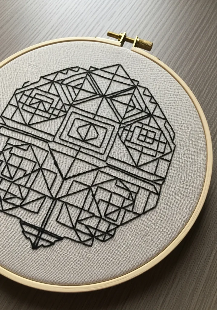 This bold embroidery design showcases an intricate geometric pattern stitched entirely in crisp black backstitch lines. The circular layout creates a structured, almost architectural look against the neutral fabric background. The sharp angles and repeating shapes give it a modern and graphic feel that stands out beautifully in a simple wooden hoop.