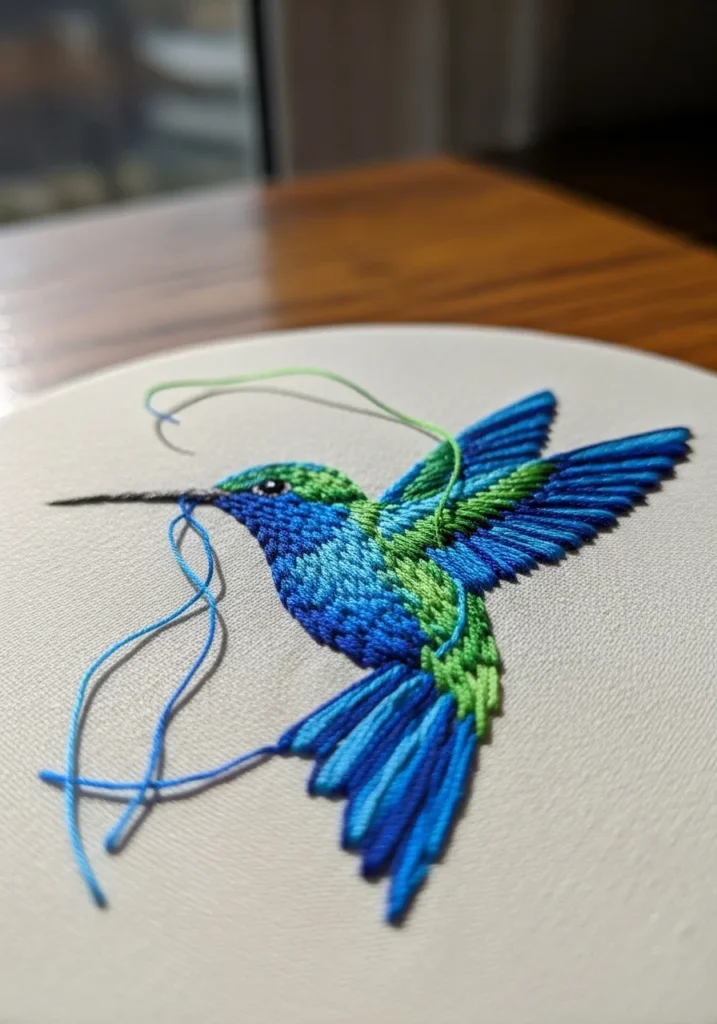 This stunning embroidery captures a hummingbird mid flight in brilliant shades of blue, teal, and green. Long and short stitches create smooth gradients across the wings, while fine outlining stitches define each feather with care. The dynamic pose and flowing thread add movement and life to the design.