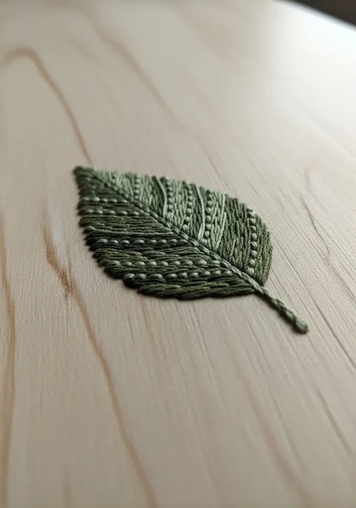 This elegant single leaf embroidery features layered green stitches that mimic natural veins and shading. The center vein is defined with backstitch, while the body of the leaf uses fishbone stitch to create realistic texture. Placed on a simple wooden surface, the details really shine.