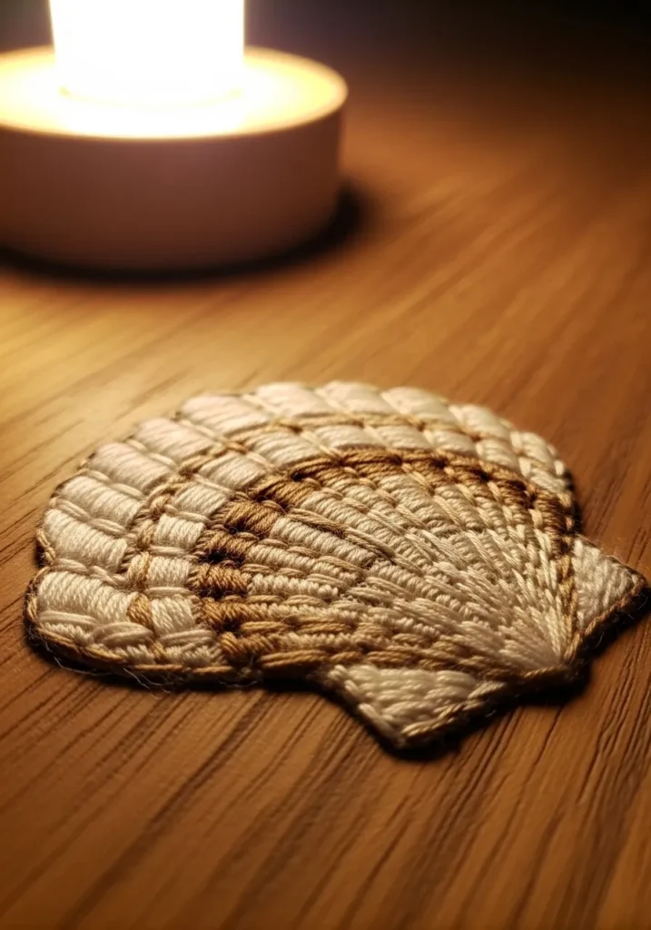 This unique shell design is stitched in warm beige and tan threads with tightly packed textured stitches that resemble woven fibers. The curved shape is defined with careful outlining, and the layered filling creates a dimensional, tactile effect. Soft lighting enhances the natural look of the design.