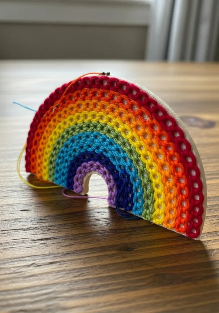 This playful rainbow design features bold arcs of red, orange, yellow, green, blue, and purple stitched in smooth, even rows. The clean lines highlight neat satin or brick style stitches that sit closely together for a solid fill. Set against light fabric, the colors absolutely glow.