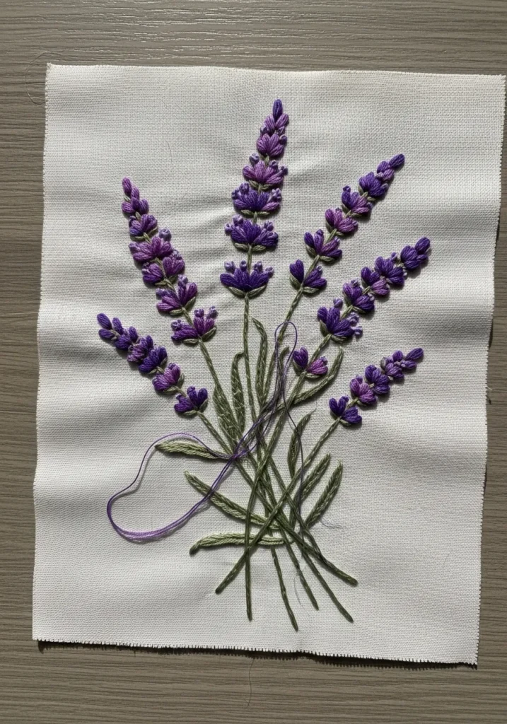 This simple botanical embroidery showcases tall lavender sprigs stitched in soft purple threads with green stems flowing downward. The blossoms use small clustered stitches that create dimension, while the slender stems are formed with clean stem stitch lines. The neutral background keeps the focus on the delicate details.