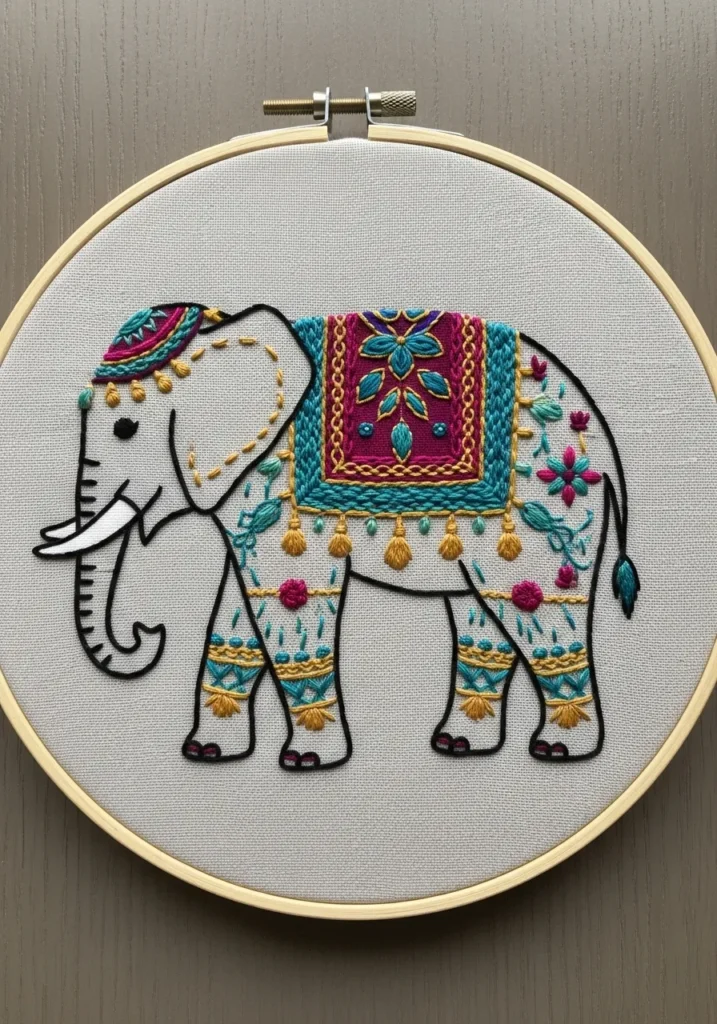 This beautiful embroidery hoop features a stylized elephant outlined in bold black backstitch, filled with intricate decorative details in rich jewel tones. The saddle cloth is stitched in deep magenta and teal with golden chain stitch borders and tiny tassel details that add playful texture. Floral accents and geometric patterns are worked in satin stitch and small decorative filler stitches, creating a layered, almost tapestry like effect against the soft neutral fabric. The light wooden hoop frames the design perfectly and keeps the focus on the vibrant threadwork.