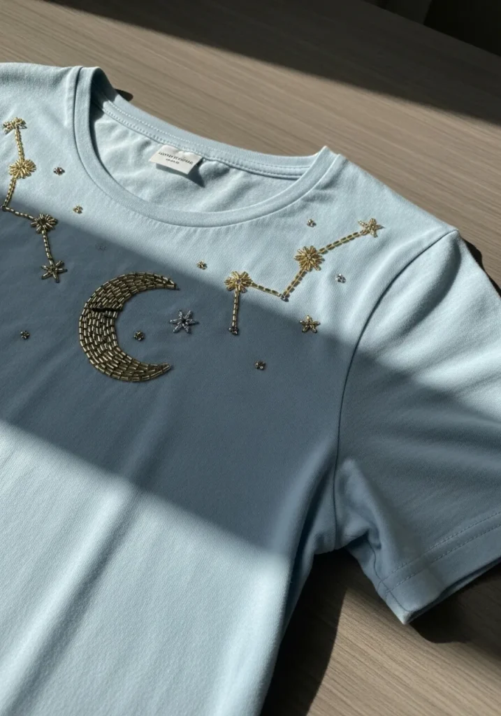 I love how this kind of design instantly makes a basic tee feel special without being over the top. If you are into soft glam details, this is such a fun project to try. The shapes are simple enough to sketch and stitch, yet the bead placement makes it look boutique worthy. It is one of those pieces that feels magical but still totally wearable with jeans or a casual skirt.