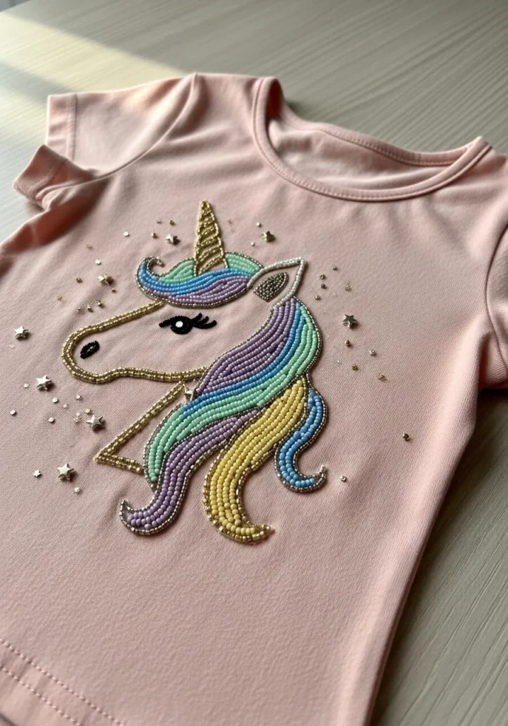 This soft blush pink T shirt features a dreamy unicorn head stitched with colorful bead embroidery. The flowing mane is created with curved rows of pastel beads in lavender, mint, baby blue, and pale yellow, giving it a layered rainbow effect. The horn is outlined in shimmering gold beads, and tiny metallic star accents are scattered around the design for extra sparkle. Fine black bead lines shape the eye and lashes, adding a sweet expression that stands out against the smooth cotton fabric.