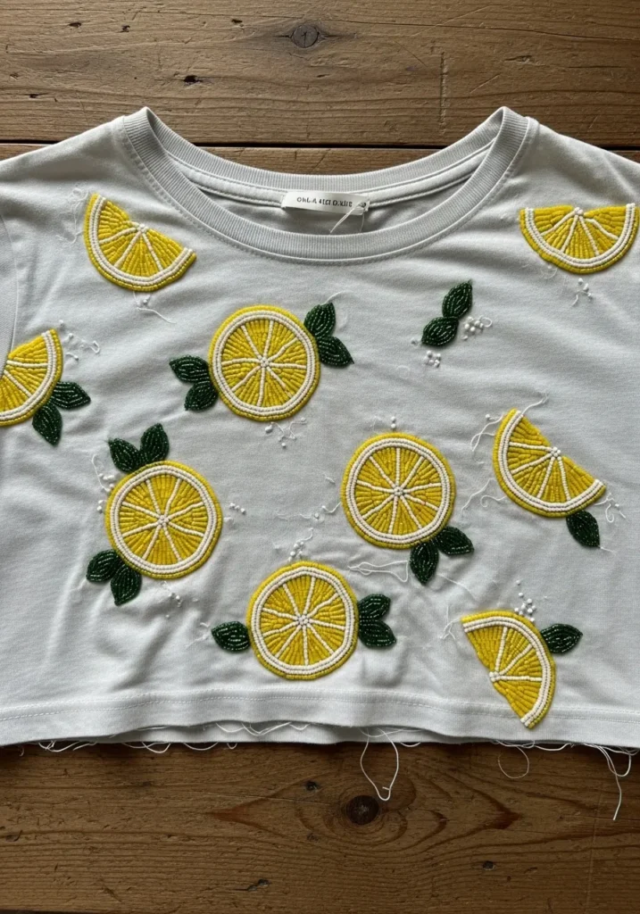 This crisp white cropped T shirt is covered with cheerful lemon slice motifs stitched in bright yellow and white beads. Each lemon round is carefully outlined, then filled with radiating bead lines to mimic the juicy segments inside. Half slices are scattered between full circles for a playful pattern effect. Deep green beaded leaves add contrast and a pop of freshness. The raised bead embroidery gives each fruit a textured, almost 3D look against the soft cotton fabric.