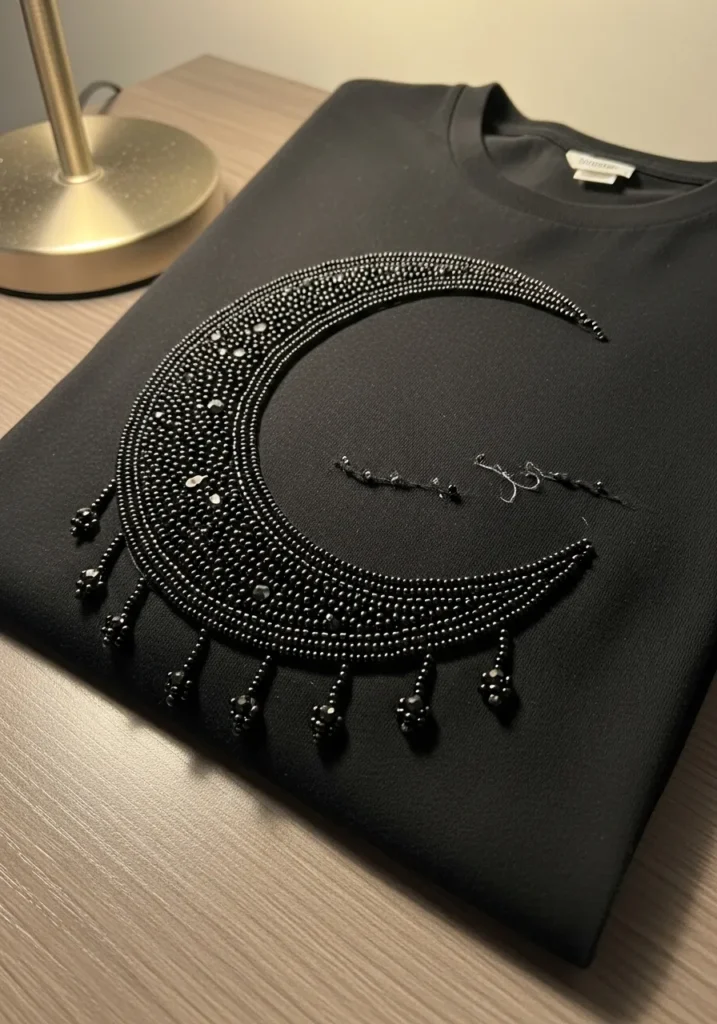 This sleek black T shirt features a dramatic crescent moon stitched entirely with glossy black beads. Rows of tiny seed beads curve gracefully to form the moon shape, creating a rich textured surface that subtly catches the light. Small bead accents are scattered within the crescent to mimic tiny craters, and delicate dangling bead drops hang from the lower edge for added movement. The monochrome design blends into the dark fabric while still standing out through its raised, dimensional embroidery.