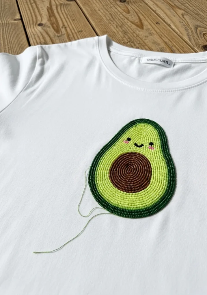 I have to admit this one makes me grin every time. If you are into playful food inspired designs, an avocado is such a fun and beginner friendly project. The rounded shape is easy to sketch, and stitching in layers feels surprisingly relaxing. It is the kind of tee that adds a little humor and charm to your everyday casual outfits.